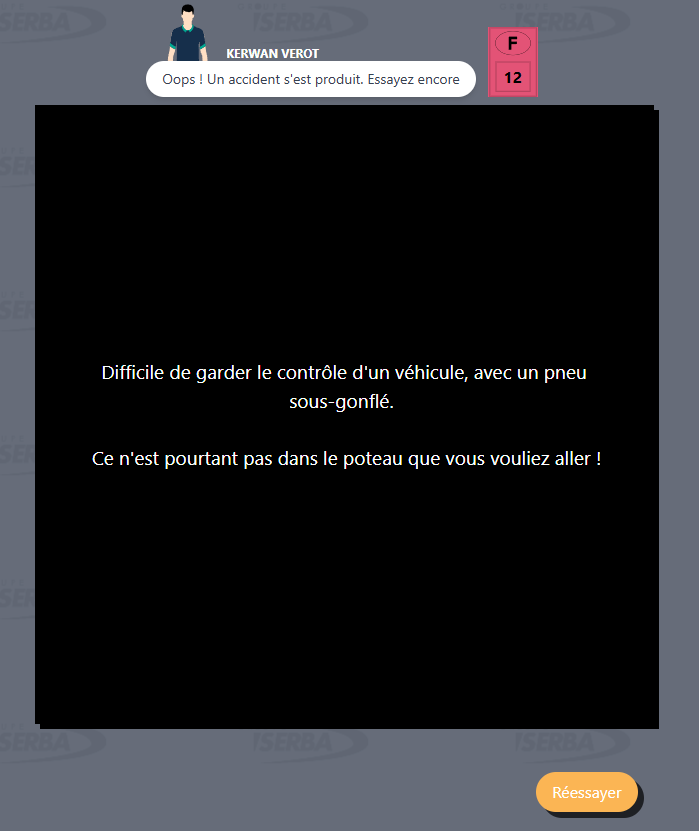 À chaque scène, le joueur doit choisir entre plusieurs actions. Un bon choix permet d’avancer, tandis qu’un mauvais réflexe déclenche un incident (accident, blessure, contretemps), présenté de manière visuelle et impactante. Le joueur est alors renvoyé à l’étape précédente pour retenter l’expérience.