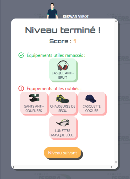 2. Affichage de la liste d’EPI : une liste d’équipements variés (bons et inutiles) est présentée au joueur : gants, lunettes, harnais, casque, bouchons d’oreilles, bottes de chantier, blouse, etc.