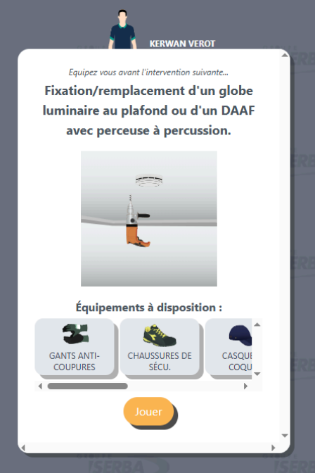 1. Brief de mission : le joueur reçoit une courte description de la tâche à réaliser (ex. : intervention électrique, travail en hauteur, manipulation de produits chimiques…).