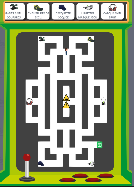 Dans ce classique des jeux d’arcade, le joueur évolue dans un labyrinthe, où il doit collecter uniquement les bons équipements de protection individuelle correspondant à une situation de travail donnée. À chaque niveau, les risques et les consignes changent : il faut donc adapter ses choix d’EPI en fonction du contexte.